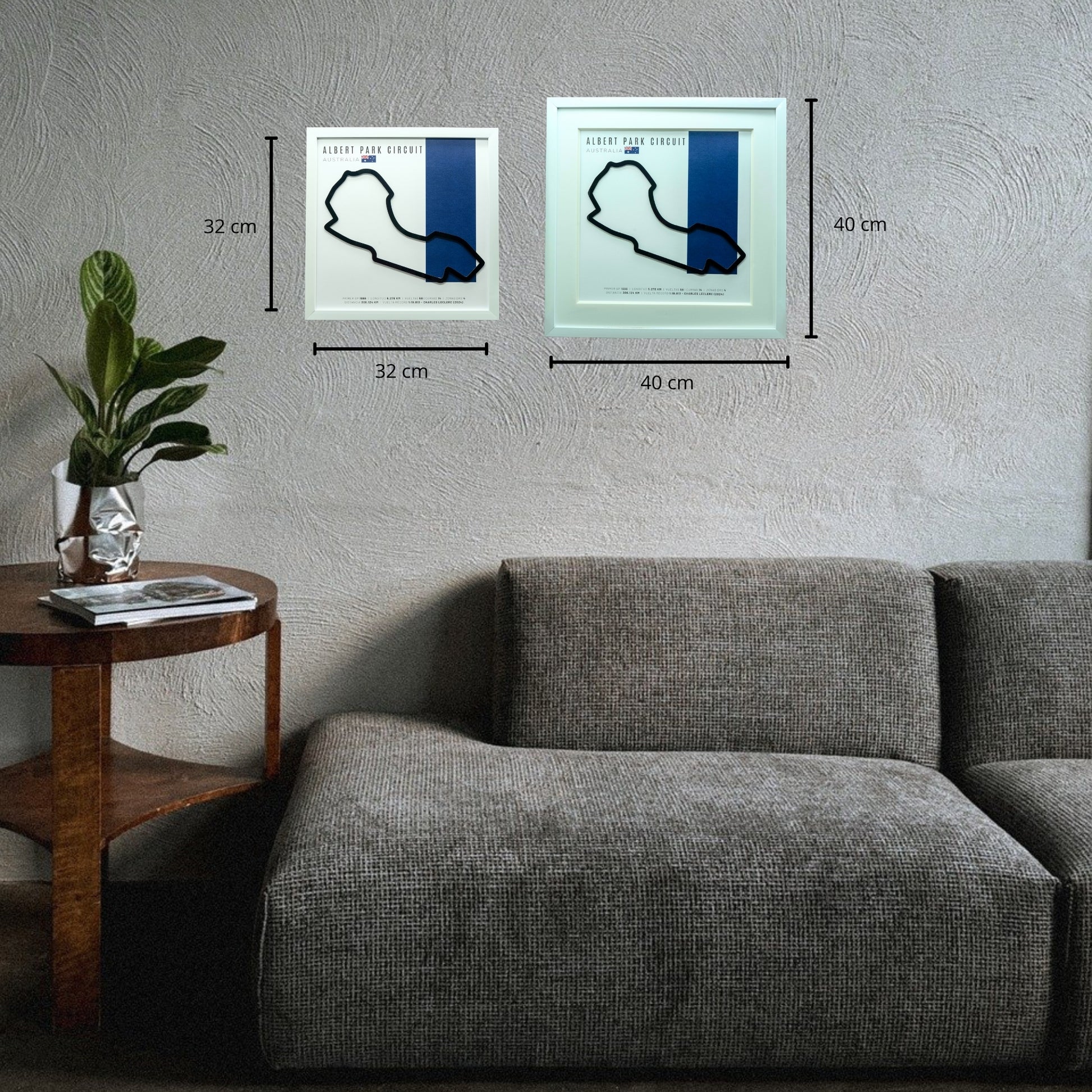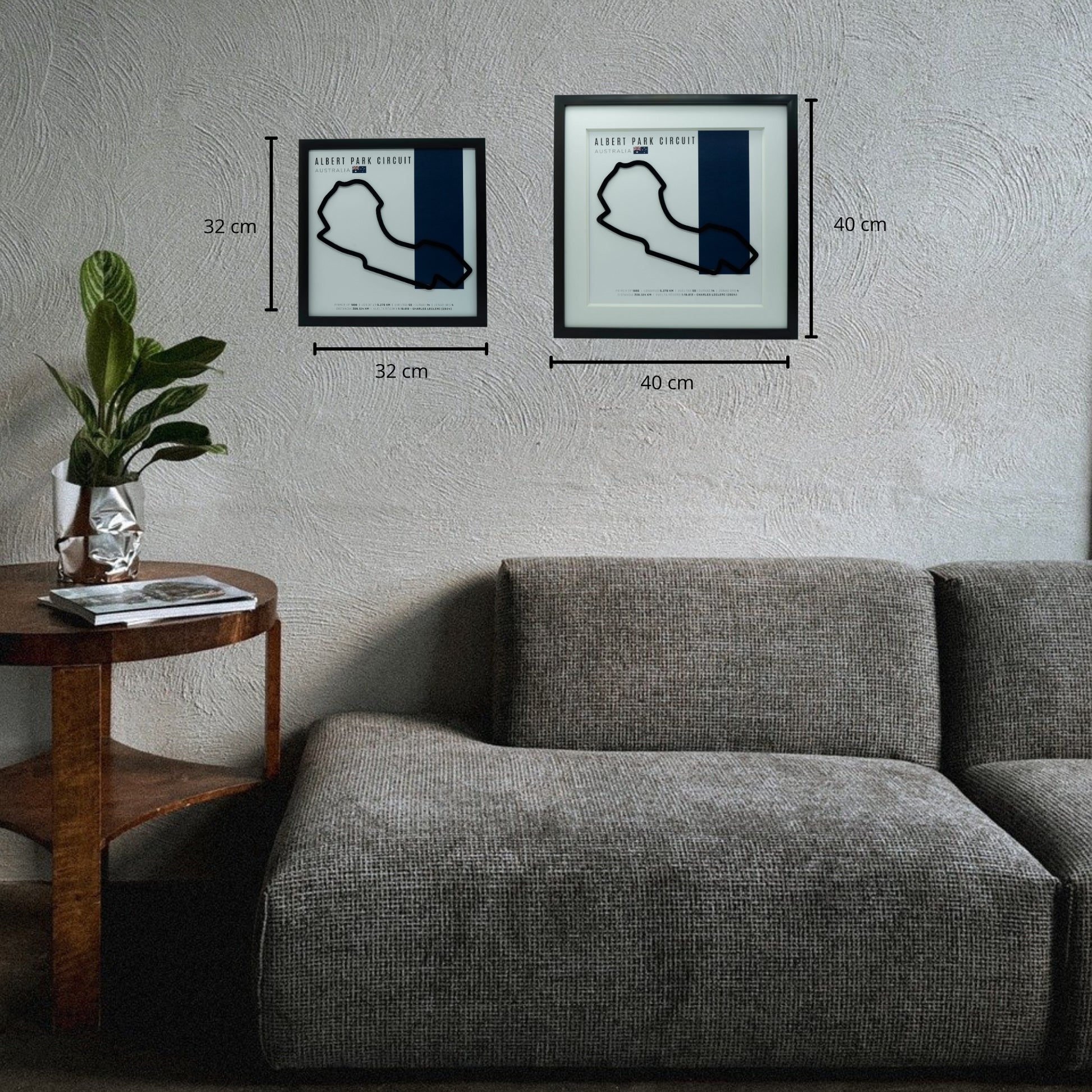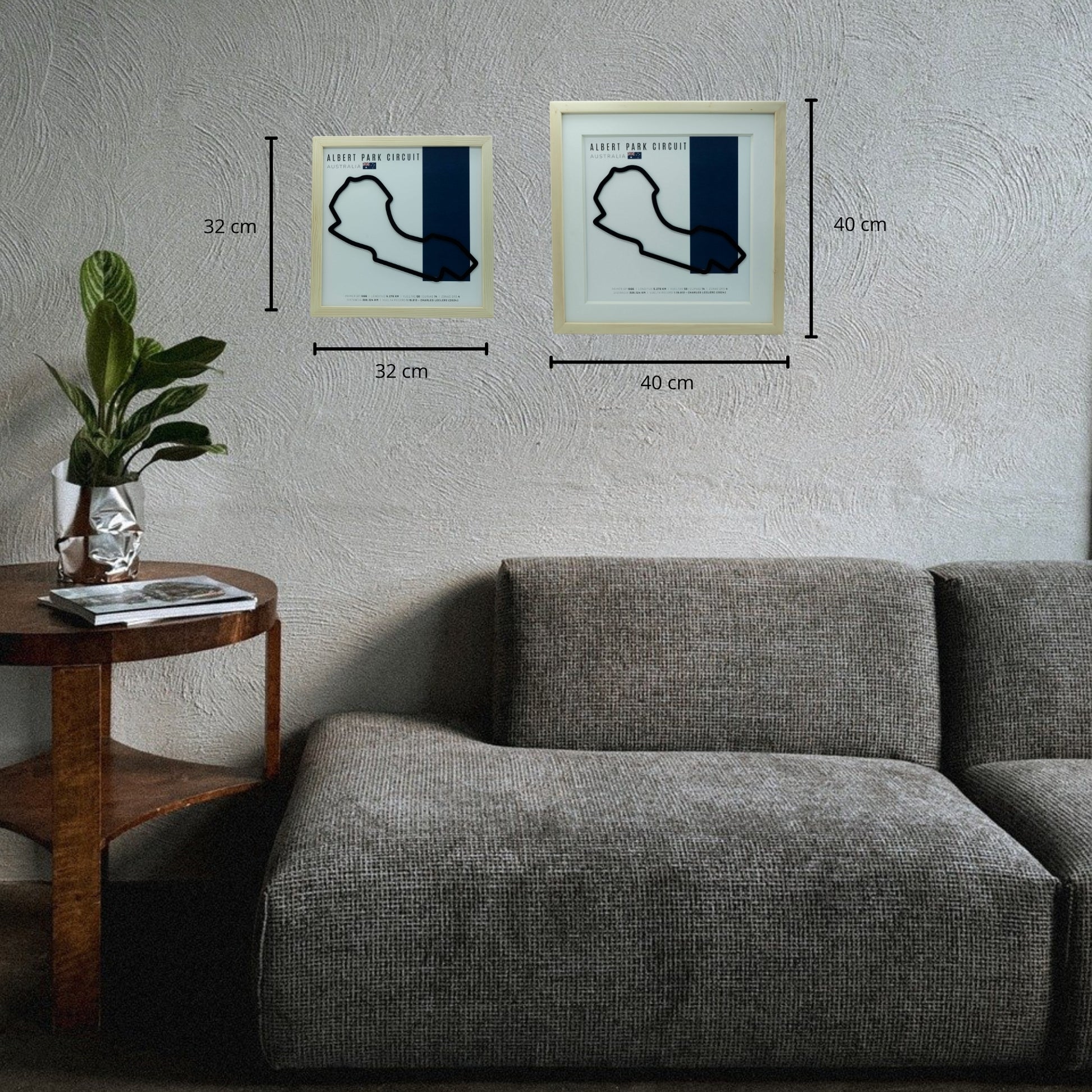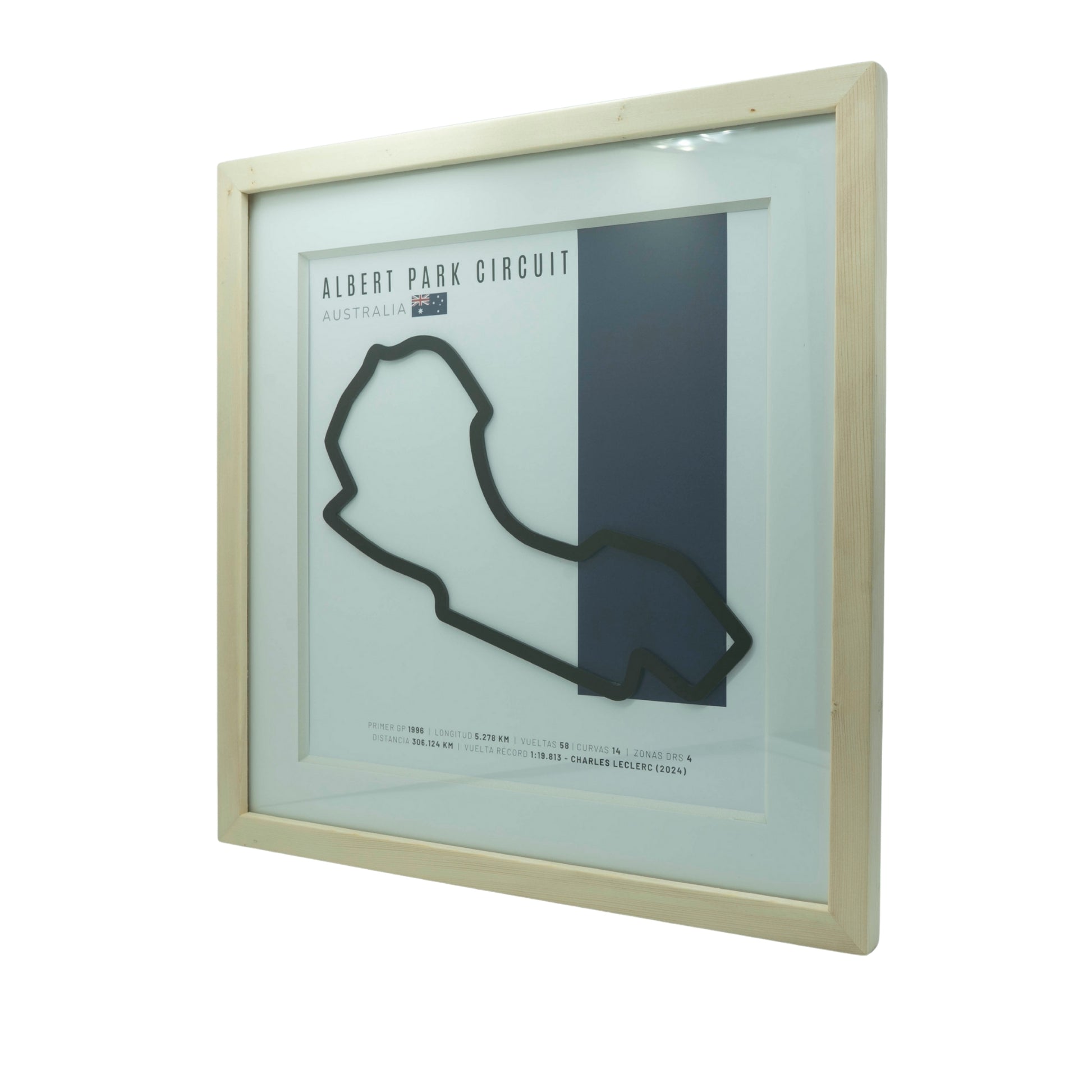 F1 – Albert Park Circuit (Australia) | Circuito 3D enmarcado en relieve 3D con acabado espejo, desarrollado sobre un diseño exclusivo del trazado. Enmarcado de calidad profesional y listo para colgar, ideal para dar presencia elegante a sala, estudio u oficina. Elige entre madera natural o molduras en negro/blanco fabricadas con poliuretano reciclado, ligeras y resistentes.