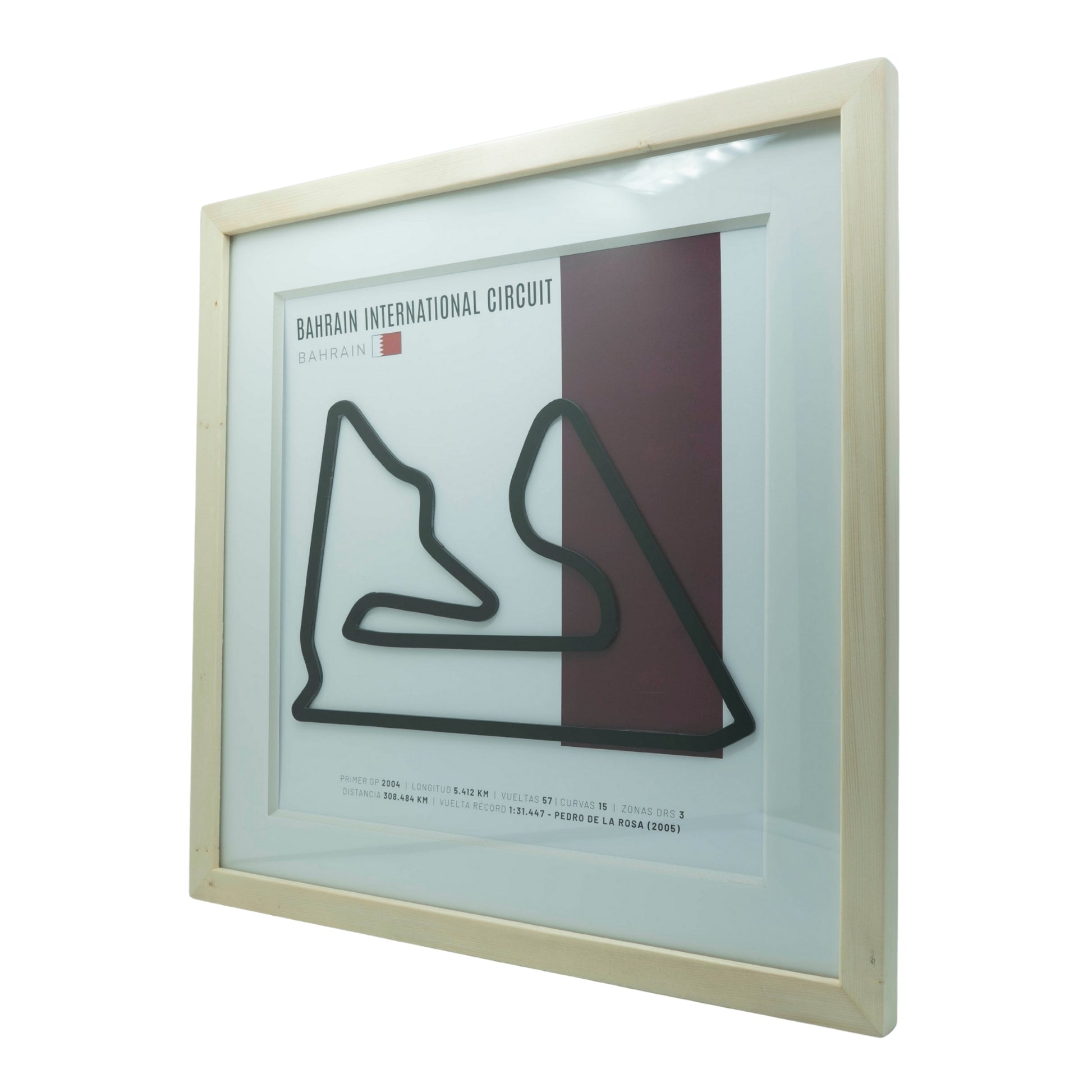 F1 – Bahrain International Circuit (Baréin) | Circuito 3D enmarcado en relieve 3D con acabado espejo, desarrollado sobre un diseño exclusivo del trazado. Enmarcado de calidad profesional y listo para colgar, ideal para dar presencia elegante a sala, estudio u oficina. Elige entre madera natural o molduras en negro/blanco fabricadas con poliuretano reciclado, ligeras y resistentes.