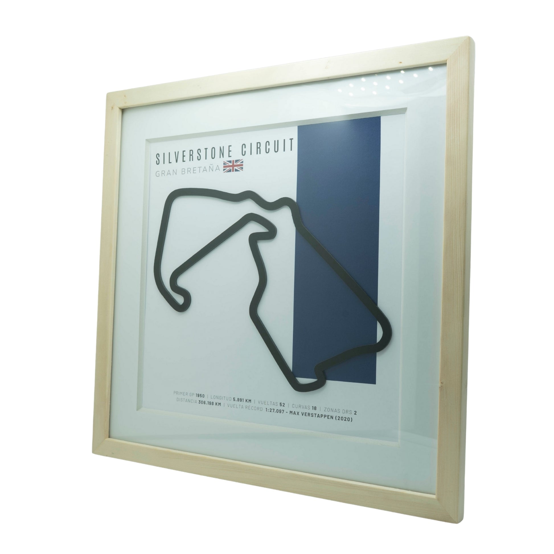 F1 – Silverstone Circuit (Gran Bretaña) | Circuito 3D enmarcado en relieve 3D con acabado espejo, desarrollado sobre un diseño exclusivo del trazado. Enmarcado de calidad profesional y listo para colgar, ideal para dar presencia elegante a sala, estudio u oficina. Elige entre madera natural o molduras en negro/blanco fabricadas con poliuretano reciclado, ligeras y resistentes.