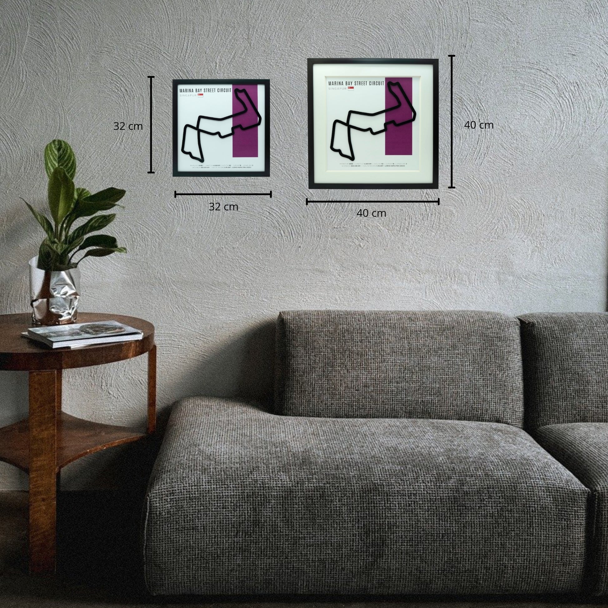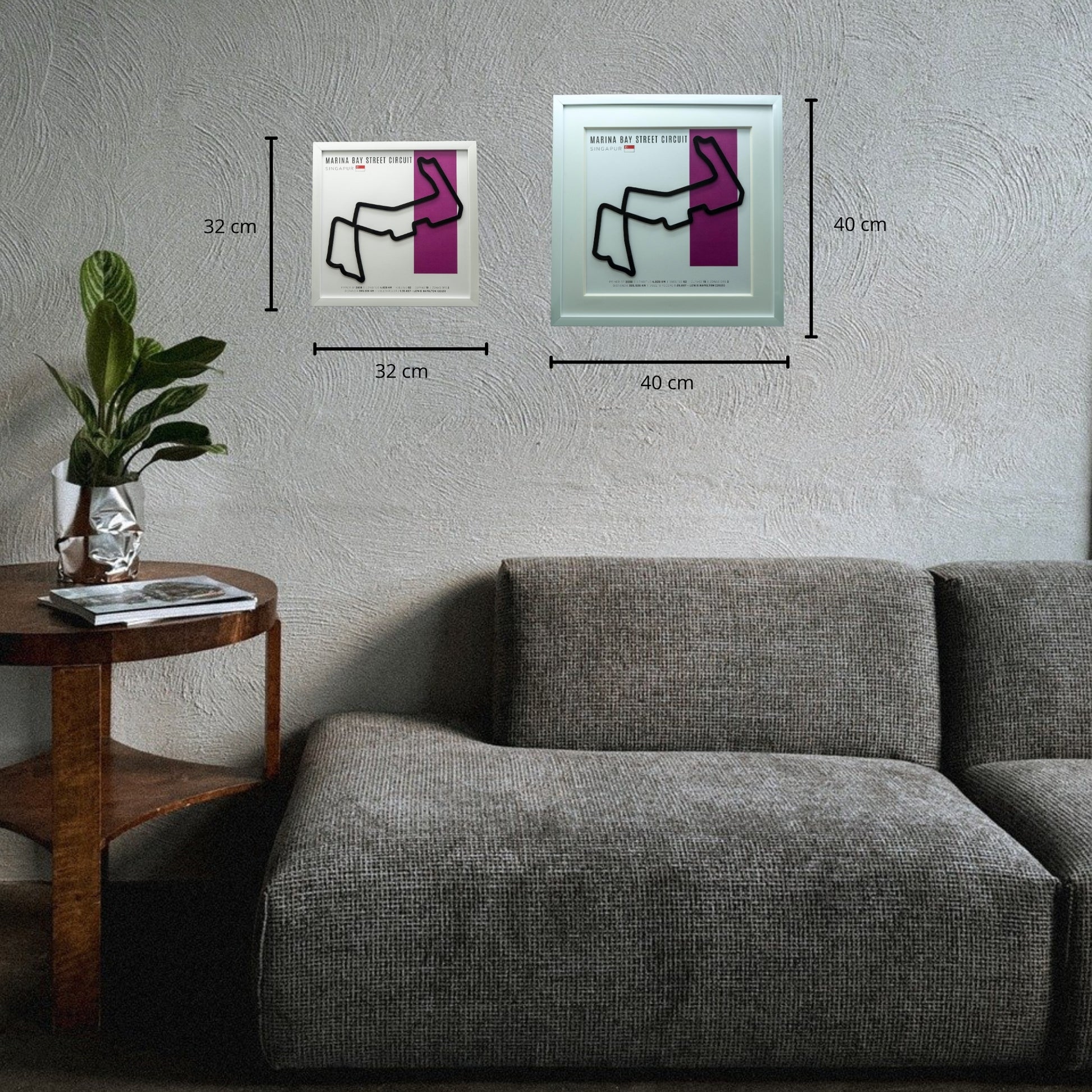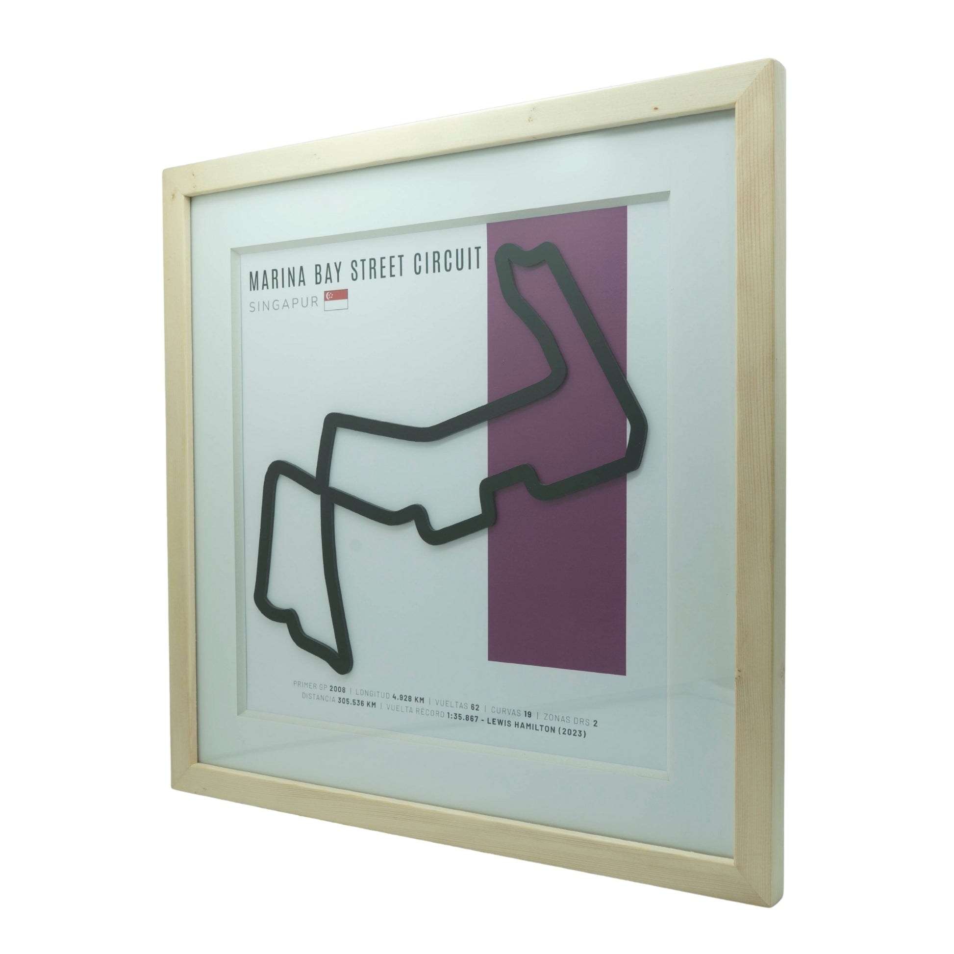 F1 – Marina Bay Street Circuit (Singapur) | Circuito 3D enmarcado en relieve 3D con acabado espejo, desarrollado sobre un diseño exclusivo del trazado. Enmarcado de calidad profesional y listo para colgar, ideal para dar presencia elegante a sala, estudio u oficina. Elige entre madera natural o molduras en negro/blanco fabricadas con poliuretano reciclado, ligeras y resistentes.