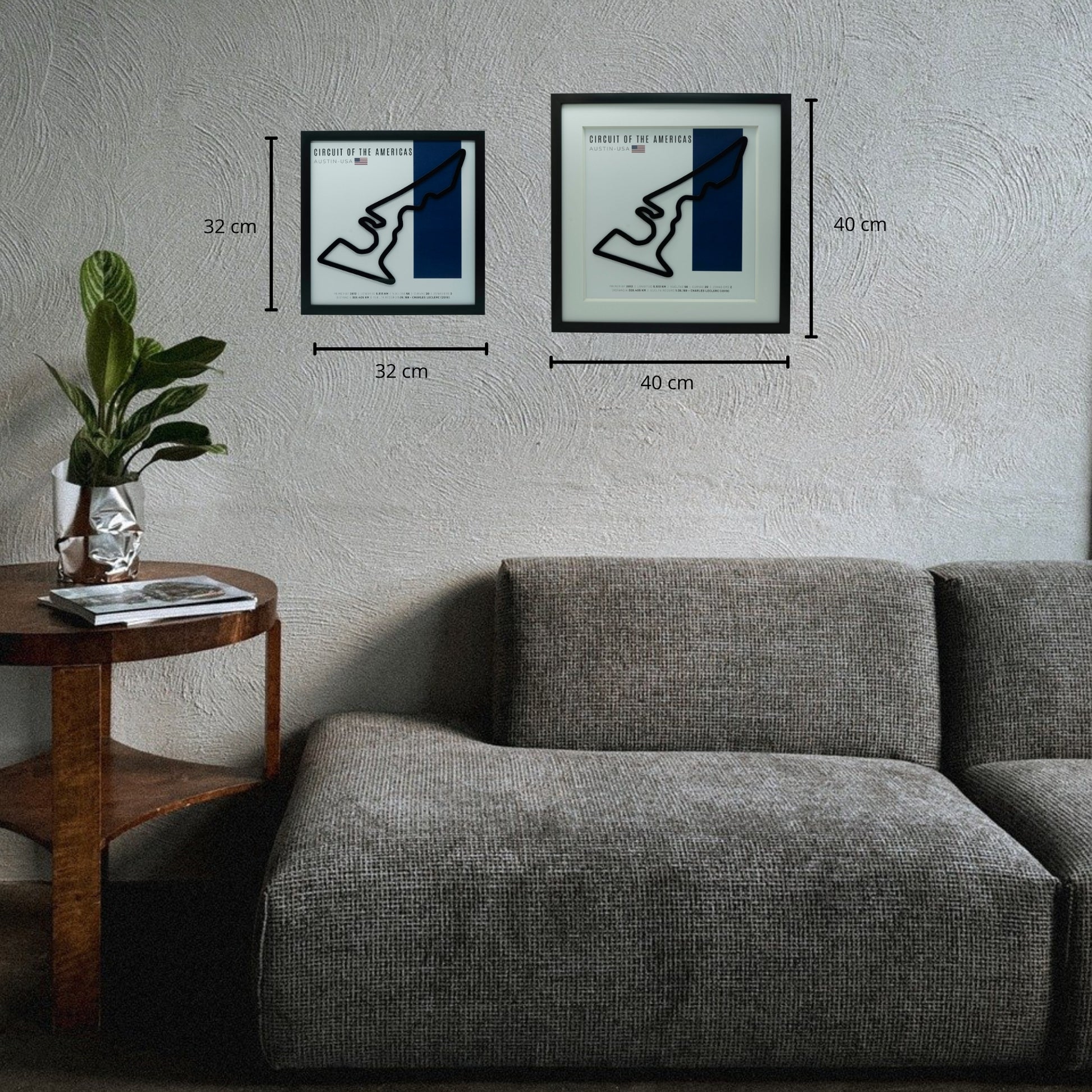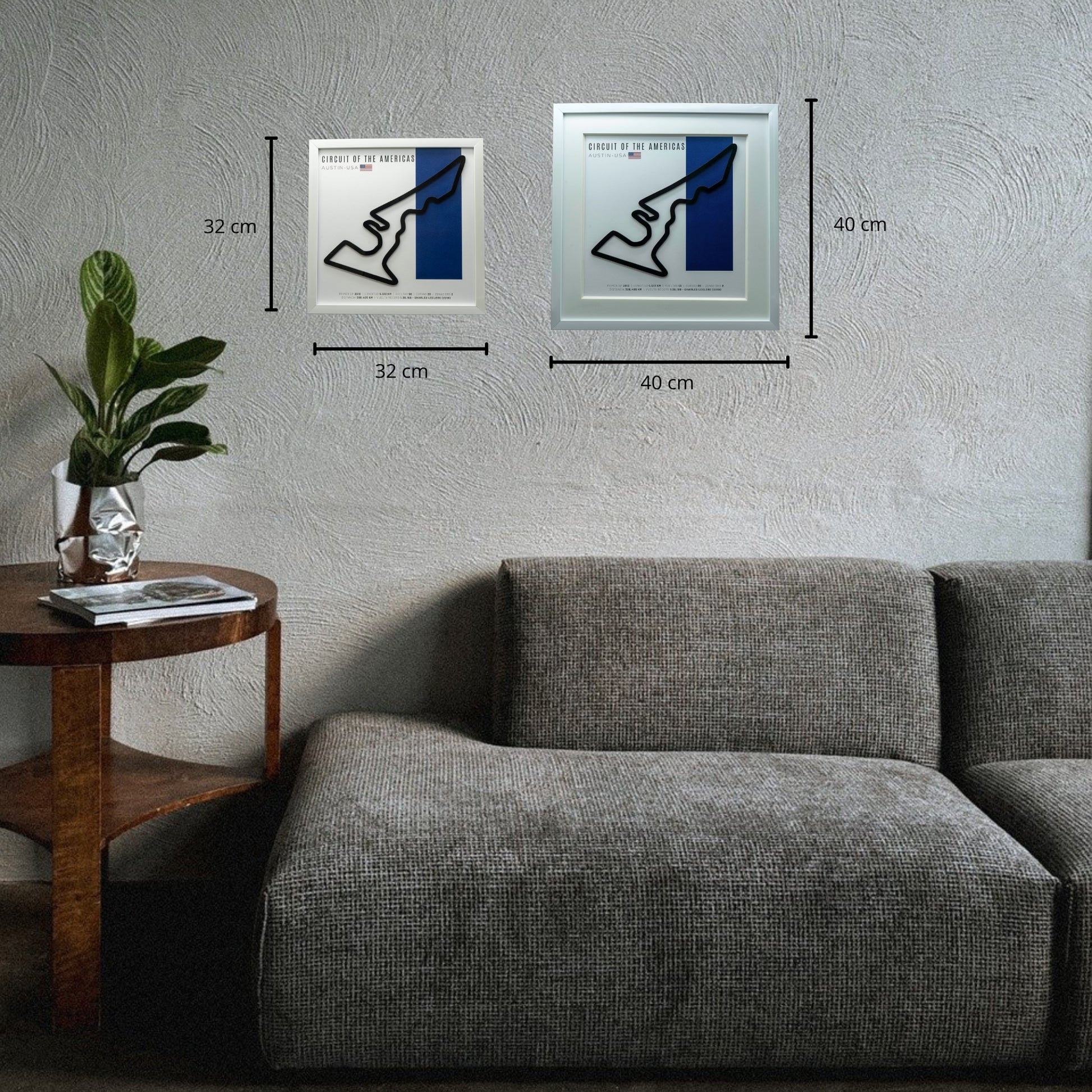 F1 – Circuit of The Americas / COTA (Estados Unidos) | Circuito 3D enmarcado en relieve 3D con acabado espejo, desarrollado sobre un diseño exclusivo del trazado. Enmarcado de calidad profesional y listo para colgar, ideal para dar presencia elegante a sala, estudio u oficina. Elige entre madera natural o molduras en negro/blanco fabricadas con poliuretano reciclado, ligeras y resistentes.