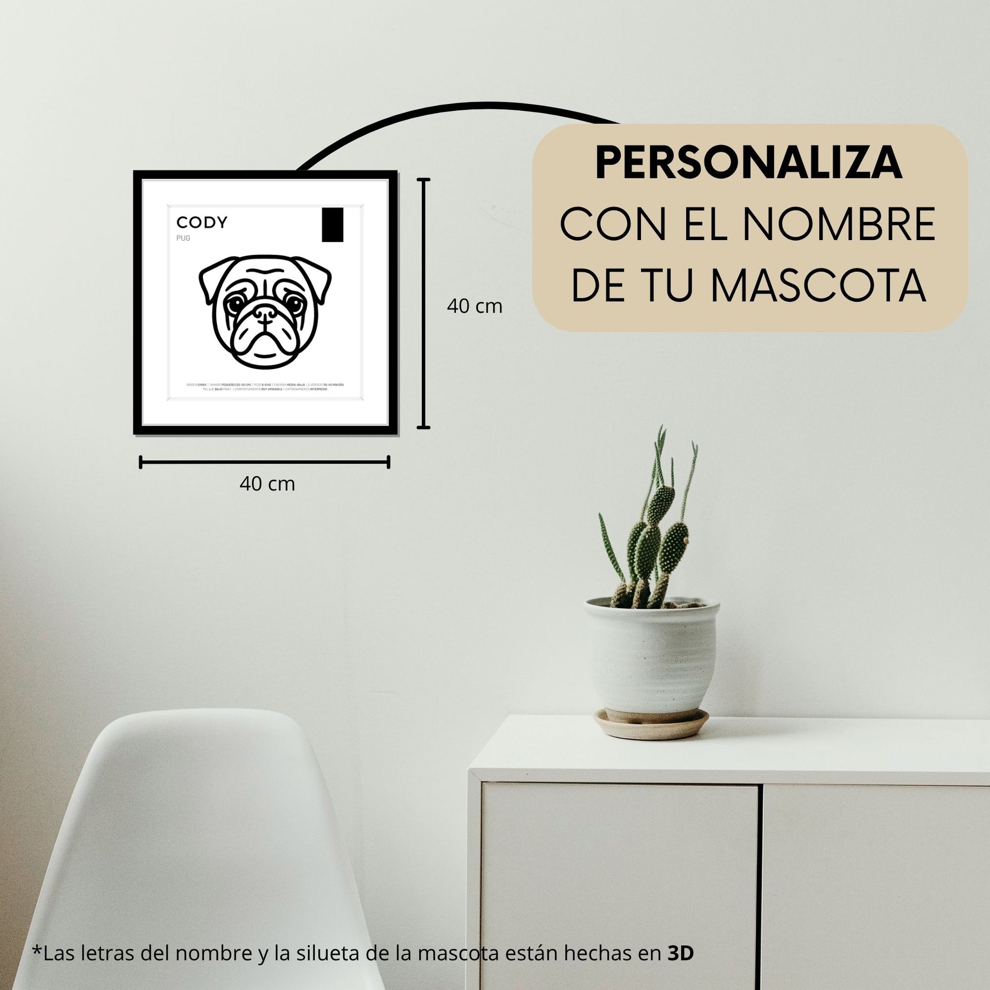 Pug — Cuadro de mascota personalizado, elaborado 100% a mano en México con siluetas en acrílico negro brillante cortadas con láser, transformando su silueta en una obra de arte moderna y minimalista. Para personalizar: escribe el nombre de tu mascota en la casilla ""NOMBRE"" (máximo 10 caracteres) — ese texto se fabricará en letras 3D de acrílico negro brillante y se montará en la parte superior del cuadro.